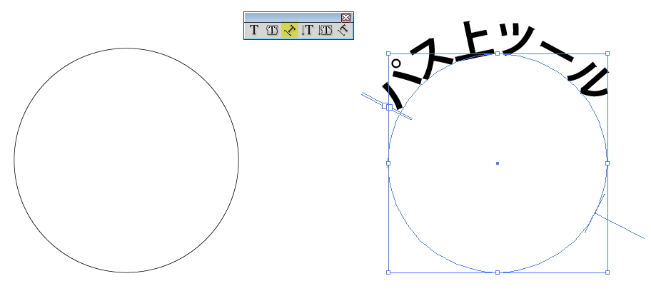 ② Type on a path tool(パステキストツール)を選択して、①で作成したパスオブジェクトの上でクリックして文字を入力していきます。