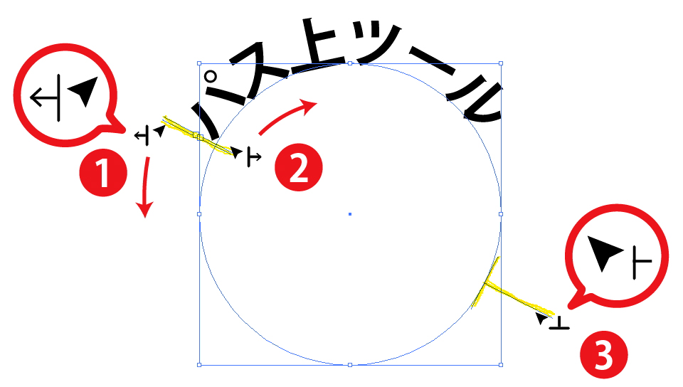 1がテキストの始め、2がテキストの終わりになるのでググーッと文字の後ろまで持っていくとわかりやすいかもしれません(3の中心部になる部分が文字のほぼ中心部にくるので)。3は中心になる部分です。