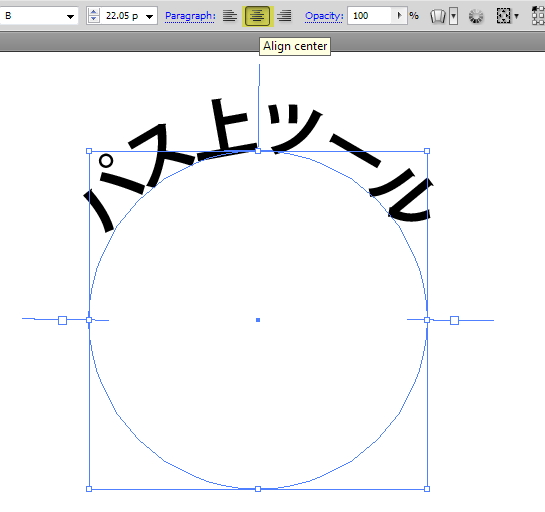 円形の場合は、1と2の始めと終わりを円の水平の左右中心部にもっていき、文字のアラインをセンターにすると、ほぼ正確な中心部になります。