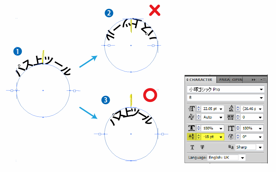 解決方法の1つとして、文字を選択した後に、キャラクタパネルの Set the baseline shift の数値をマイナス値入力をすることで、逆さまになることを避けられます。